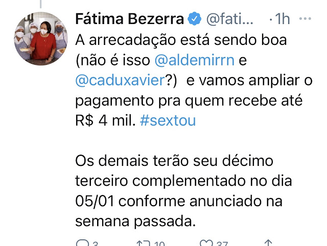 No Twitter a governadora Fátima Bezerra brinca com o secretário de Planejamento, Aldemir Freire.