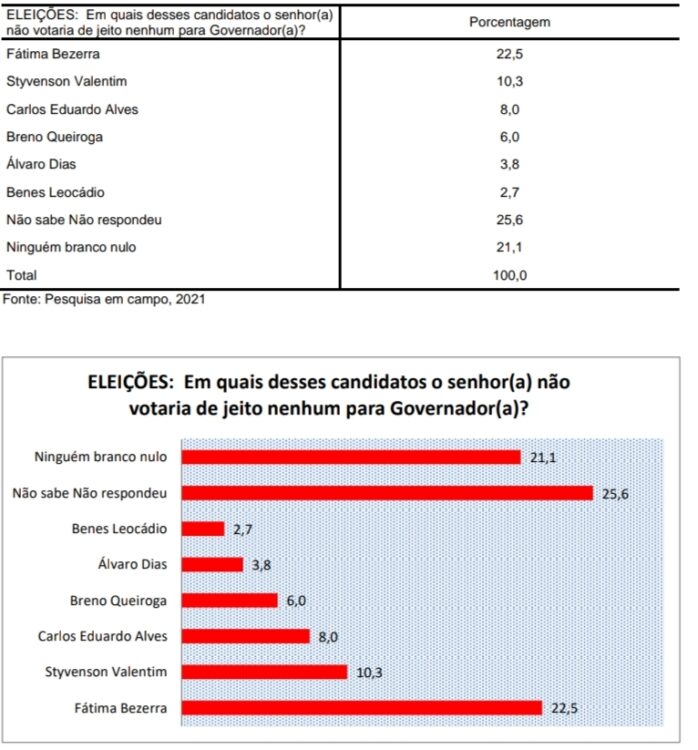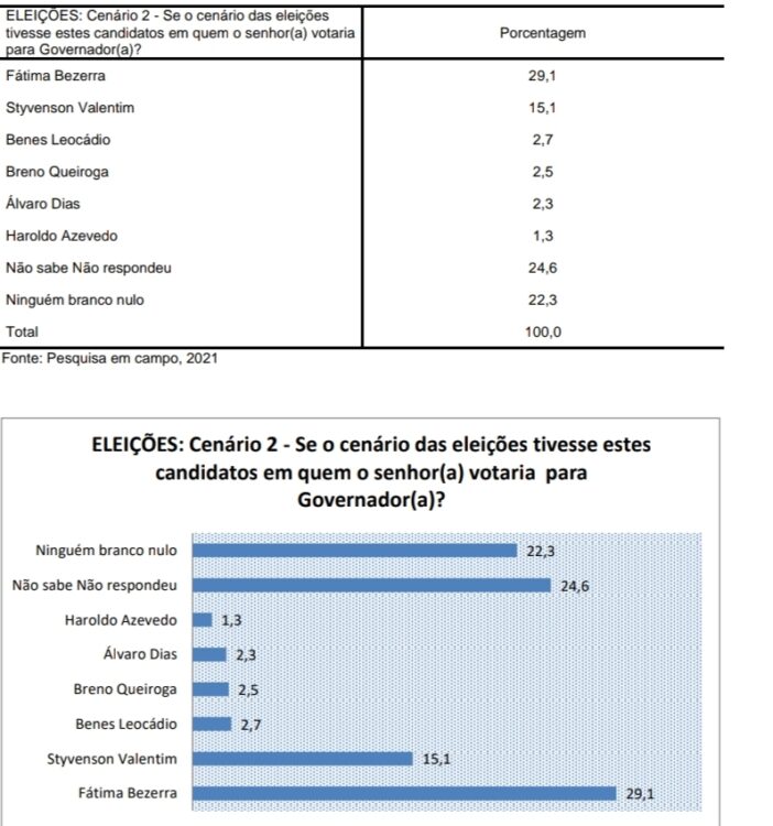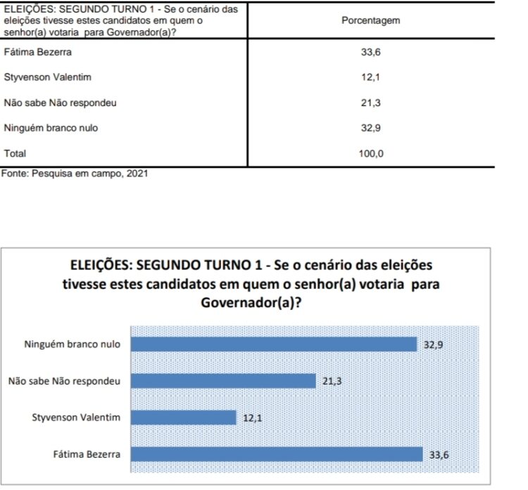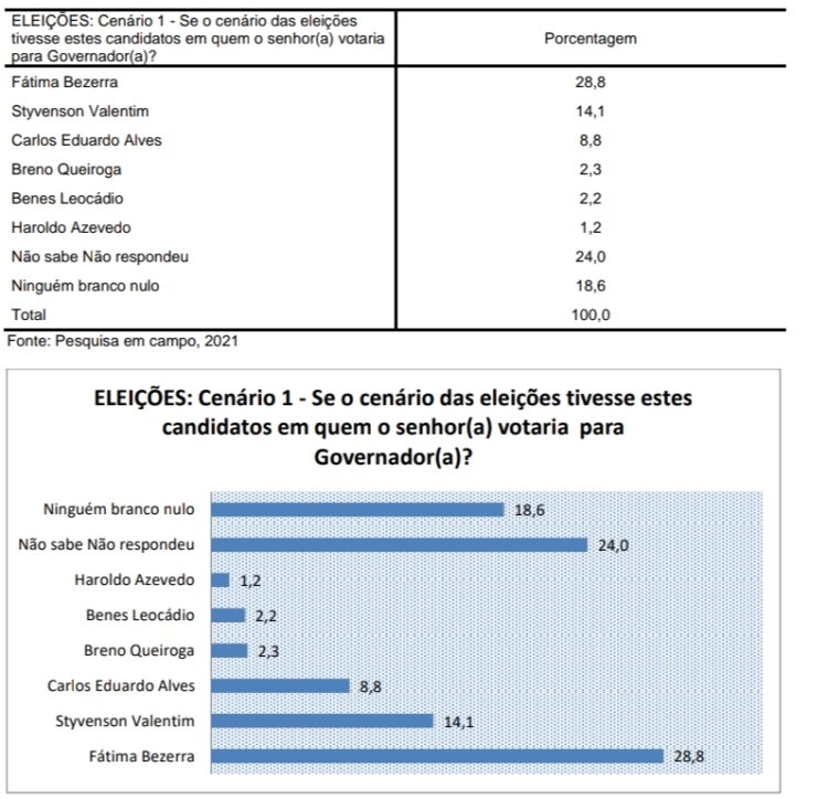 A governadora Fátima Bezerra (PT) lidera seguida pelo senador Styvenson Valentim (PODEMOS).